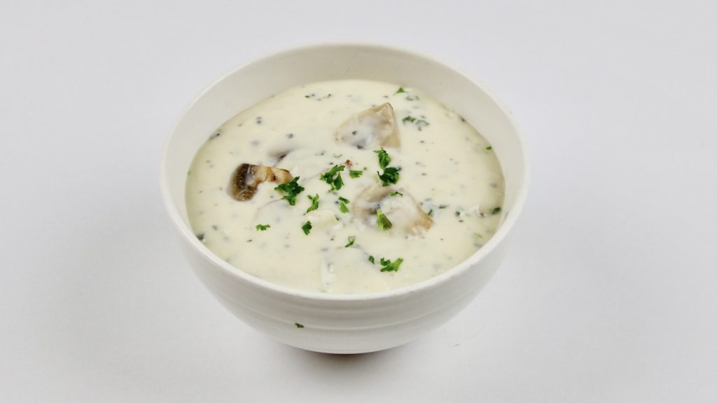 Ui, champignons, peterselie, water, kookroom, zeezout, peper, arrowroot, truffel tapenade.