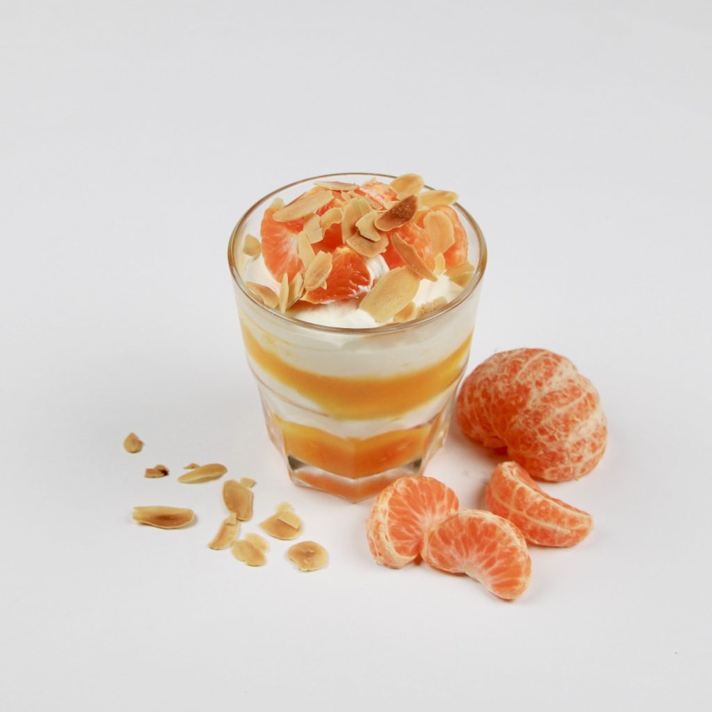 mascarpone, slagroom, erythtritol, mandarijn, arrowroot, amandelschaafsel
