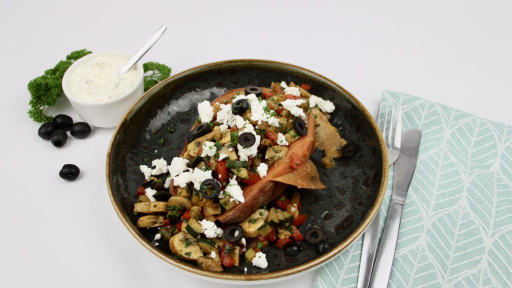 Zoete aardappel Grieks: zoete aardappel, ui wit, paprika rood (bio), courgette, champignons, knoflook, zonnebloemolie, peterselie, feta, zeezout, peper, zwarte olijf, paprikapoeder, koriander gemalen, komijnpoeder, oregano, cayennepoeder, uienpoeder.