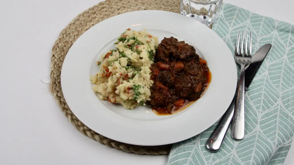 Stracotto: Runderriblappen, wortel, bleekselderij, tomaat, salie, rozemarijn, tijm, olijfolie, roomboter, ui, runderbouillon, rode wijn, tomatenpuree, zeezout, peper, kookroom.