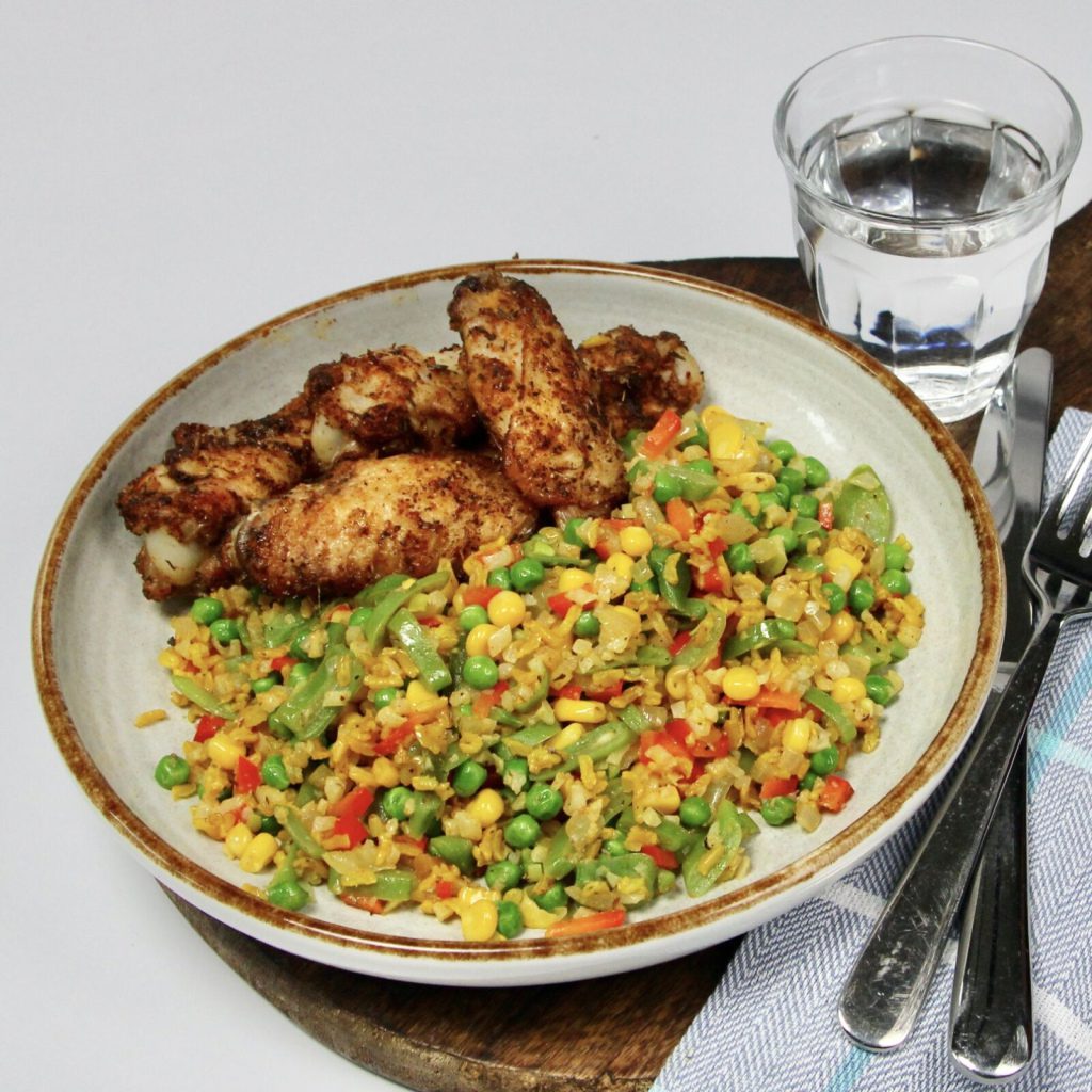 Cajunrijst: zonnebloemolie, ui wit, knoflook, cajunkruiden, paprika, volkoren basmati rijst(bio), kurkuma, bloemkoolrijst, mais(bio), doperwten, snijbonen, zeezout, peper wit gemalen