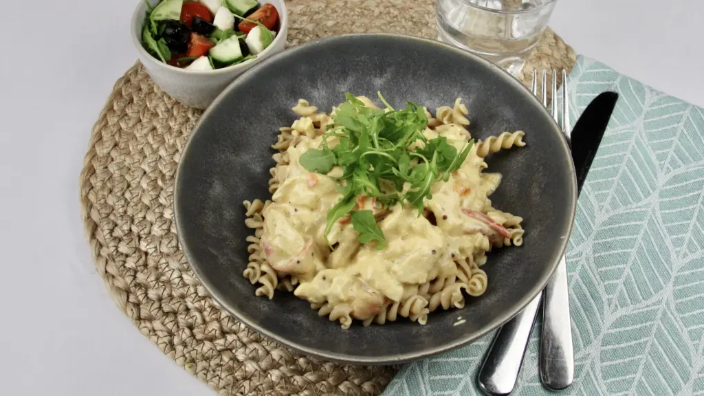 Fussili pasta naar keuze met kip in mosterd- roomsaus en een luxe salade: